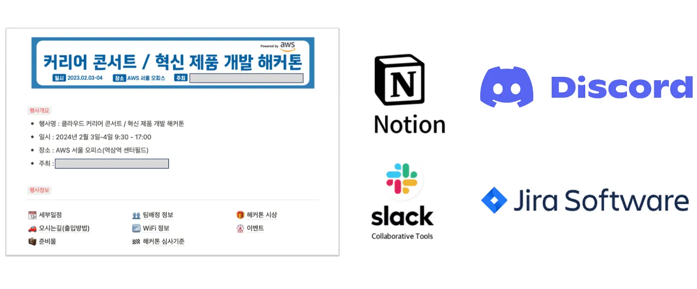 해커톤의 운영 툴로 우리는 노션, 디스코드, 슬랙, 그외 현업에서 사용하는 다양한 협업 도구를 사용합니다. 참가자들은 자연스럽게 현업에서 사용하는 툴을 익히고 효과적으로 해커톤을 진행할 수 있습니다.