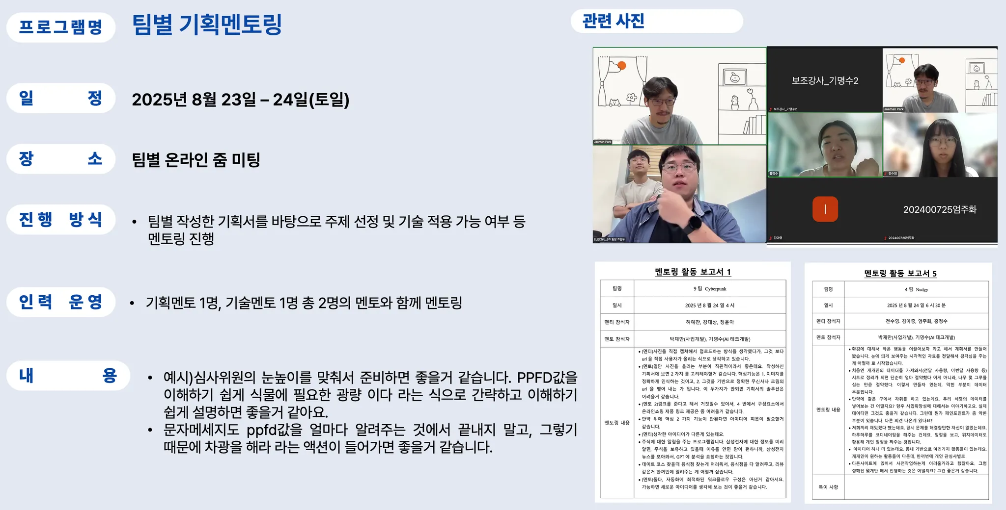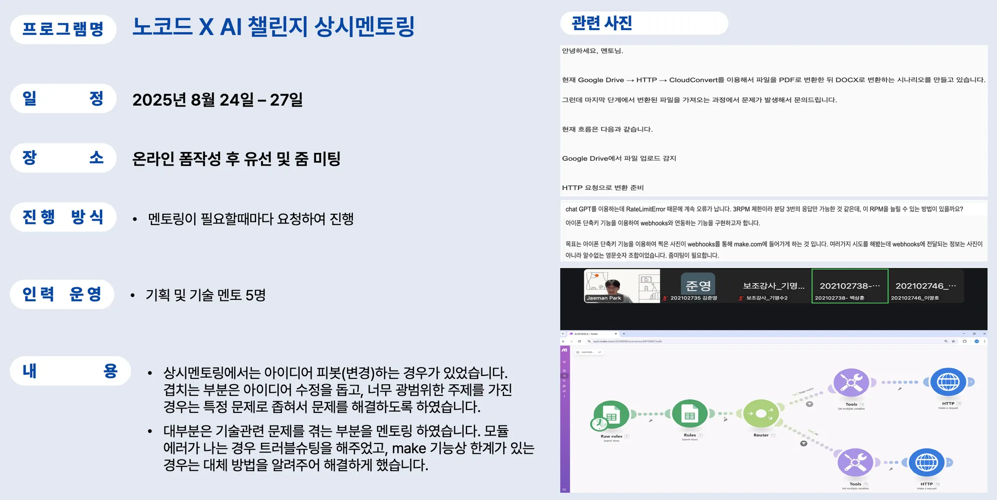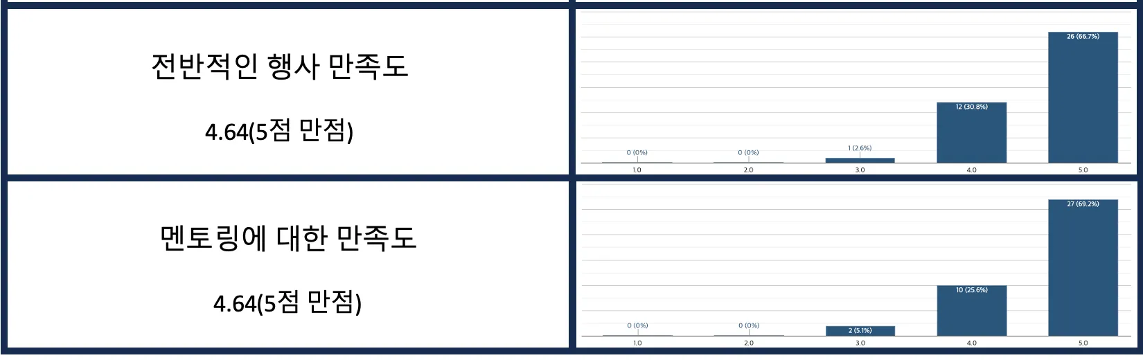 행사날 대면 멘토링은 매우 도움이 되었고 정말 정성스럽게 설명해주셔서 감사했다. 비대면 멘토링은 대면 보다는 한계가 있었다.