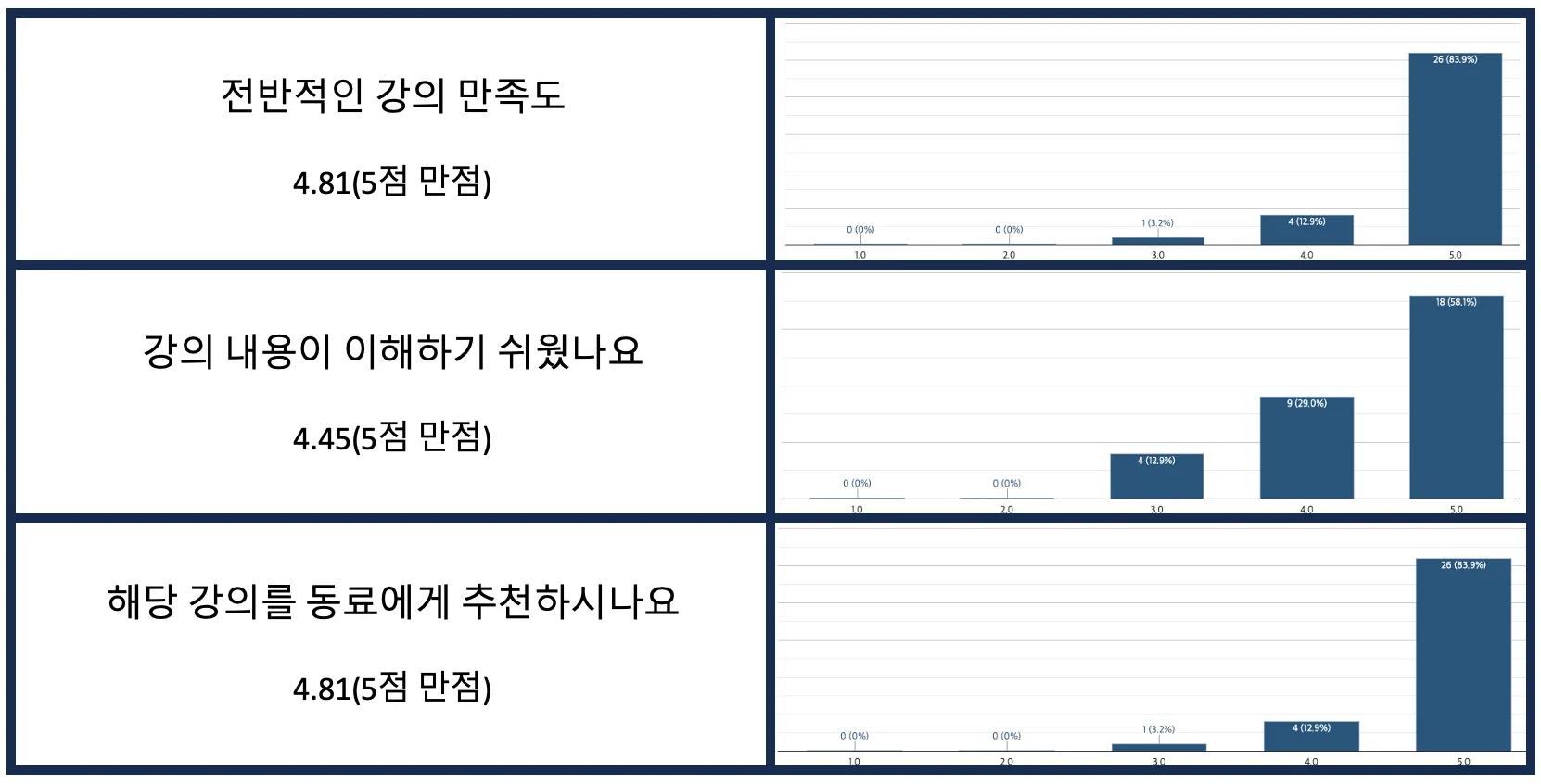 기본적인 개념부터 설명해주셔서 활동에 몰입하기 좋았습니다. 그리고 강사님과 함께 실습을 진행하니 큰 어려움 없이 활동을 마칠 수 있었습니다.