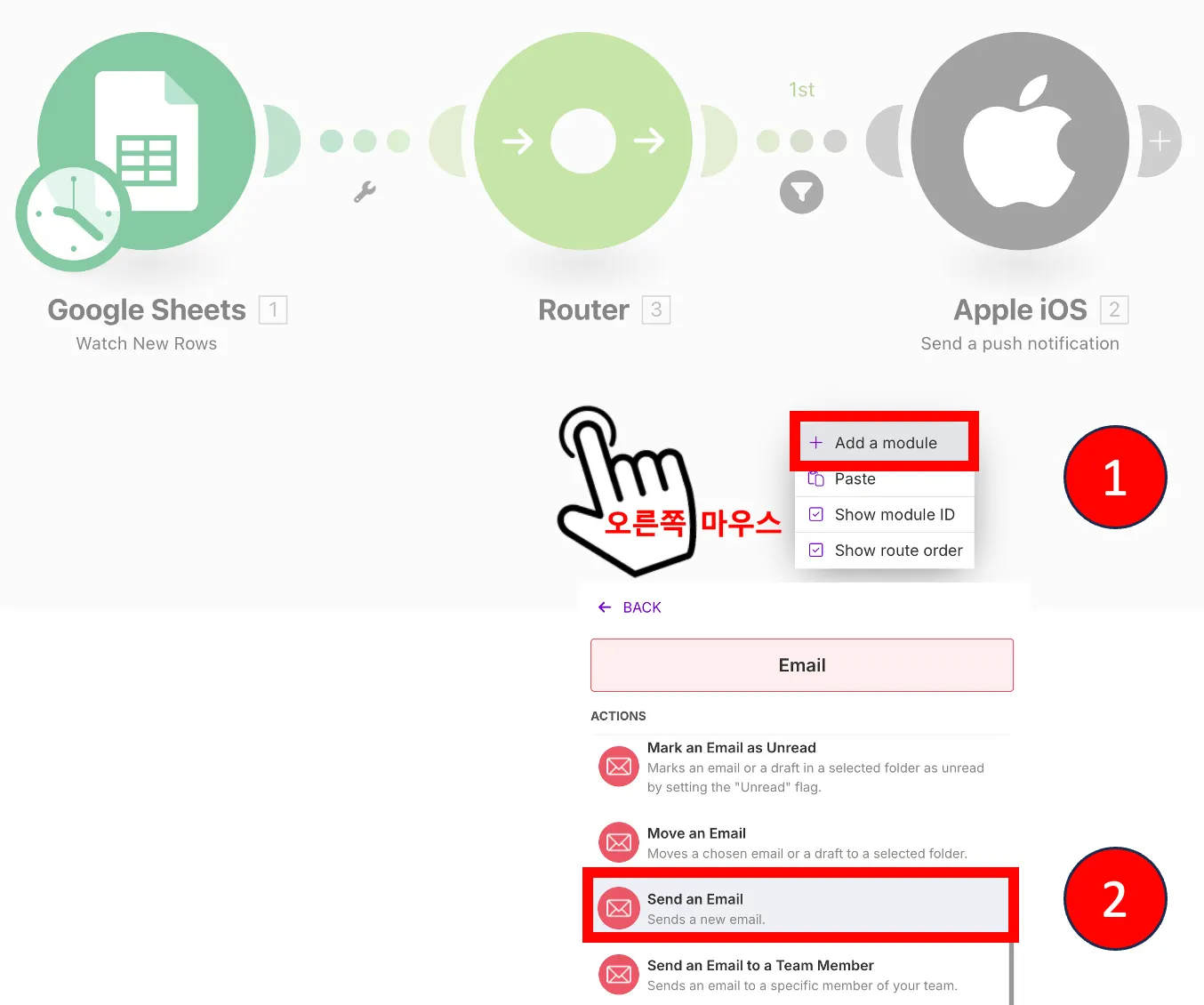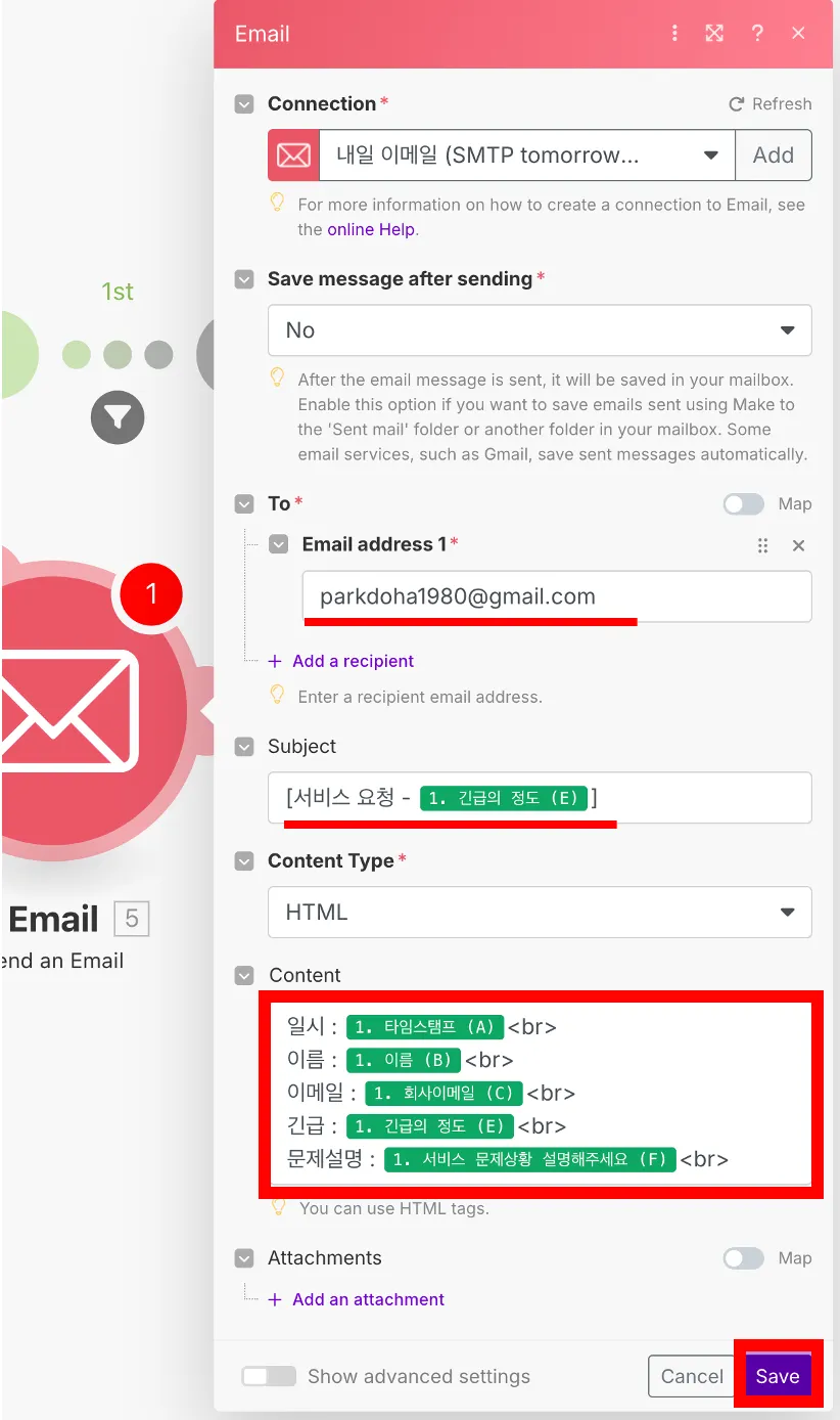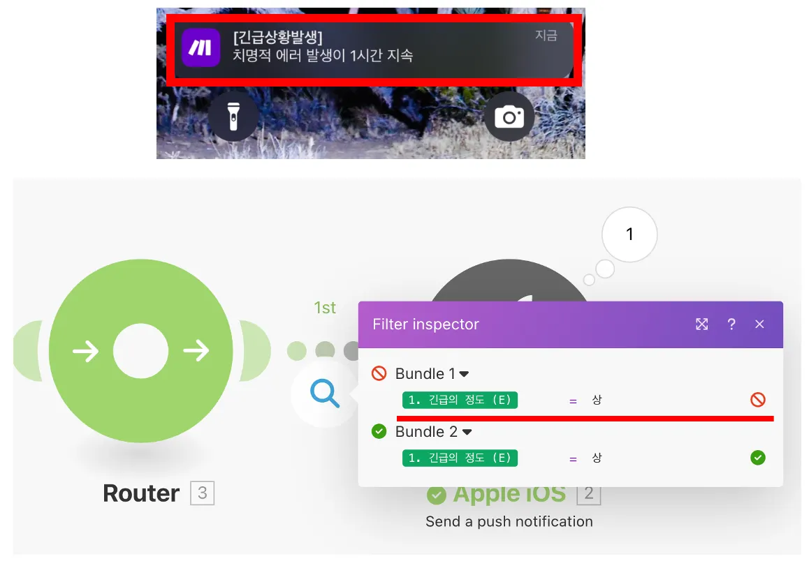 Run once 클릭하여 잘 동작하는지 확인하자! 긴급의 정도가 ‘상’ 인 것만 메세지가 온것을 확인할 수 있다