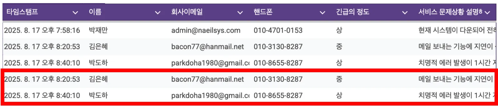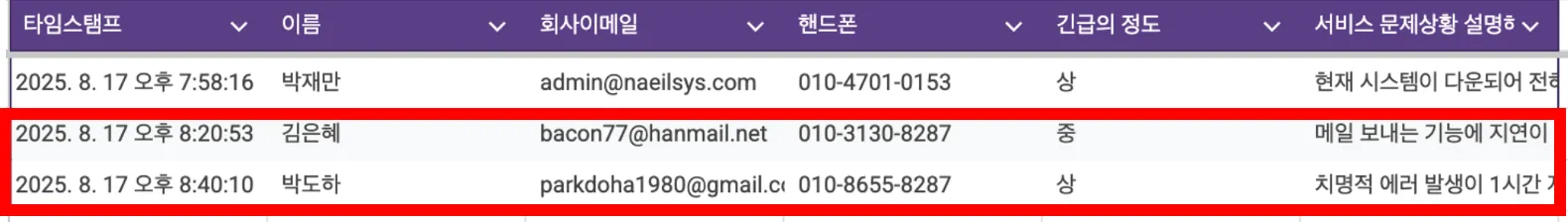 필터 테스트를 위해 구글시트에 두개 행(긴급의 정도 ‘중’ 과 ‘상’)을 추가해보자