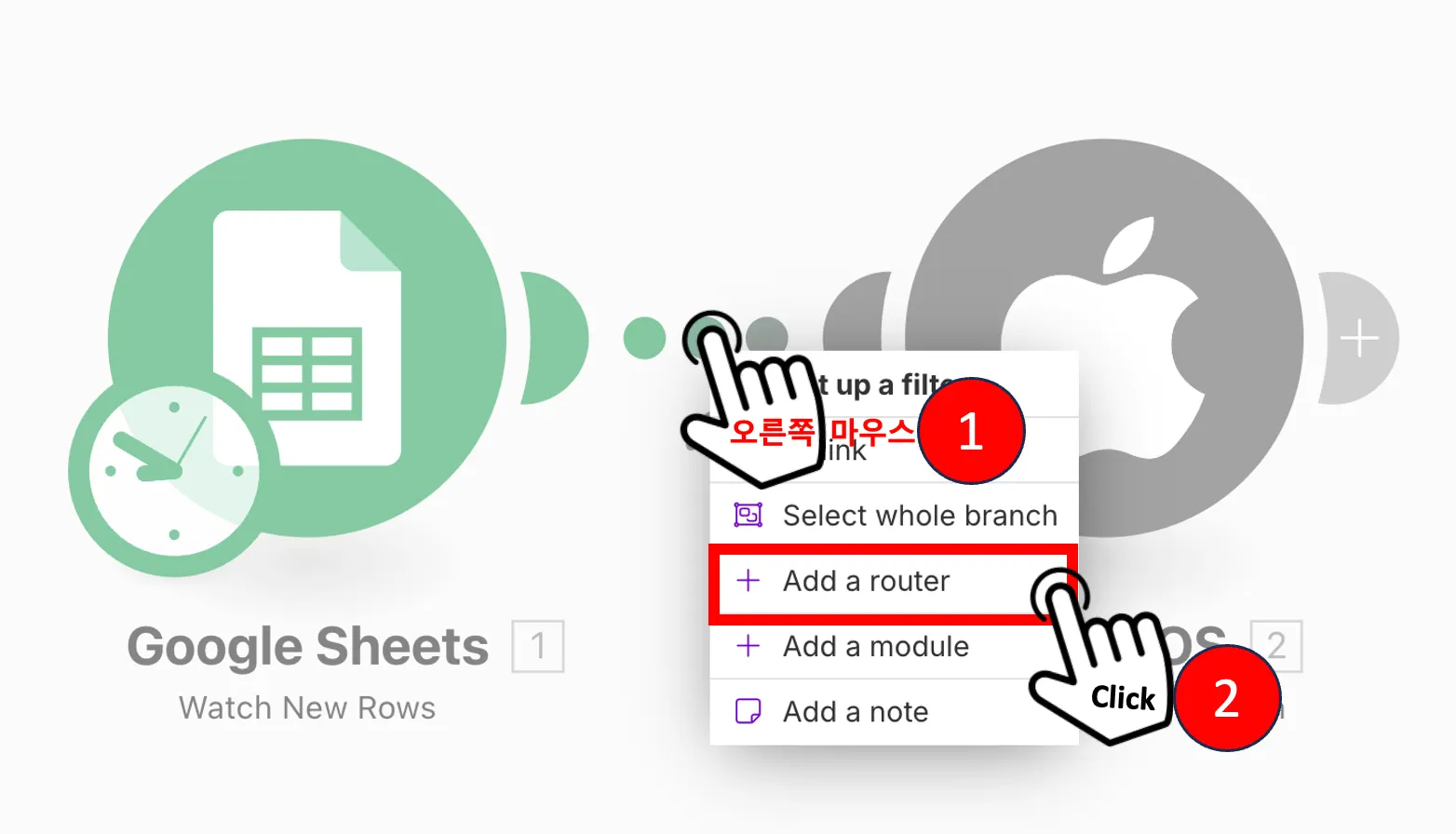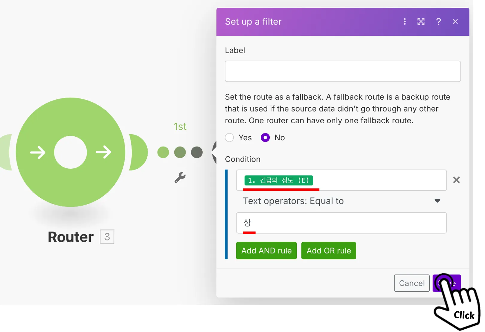 라우터 동작 확인을 위해 필터 구글시트에 두개 행(긴급의 정도 ‘중’ 과 ‘상’)을 추가해보자