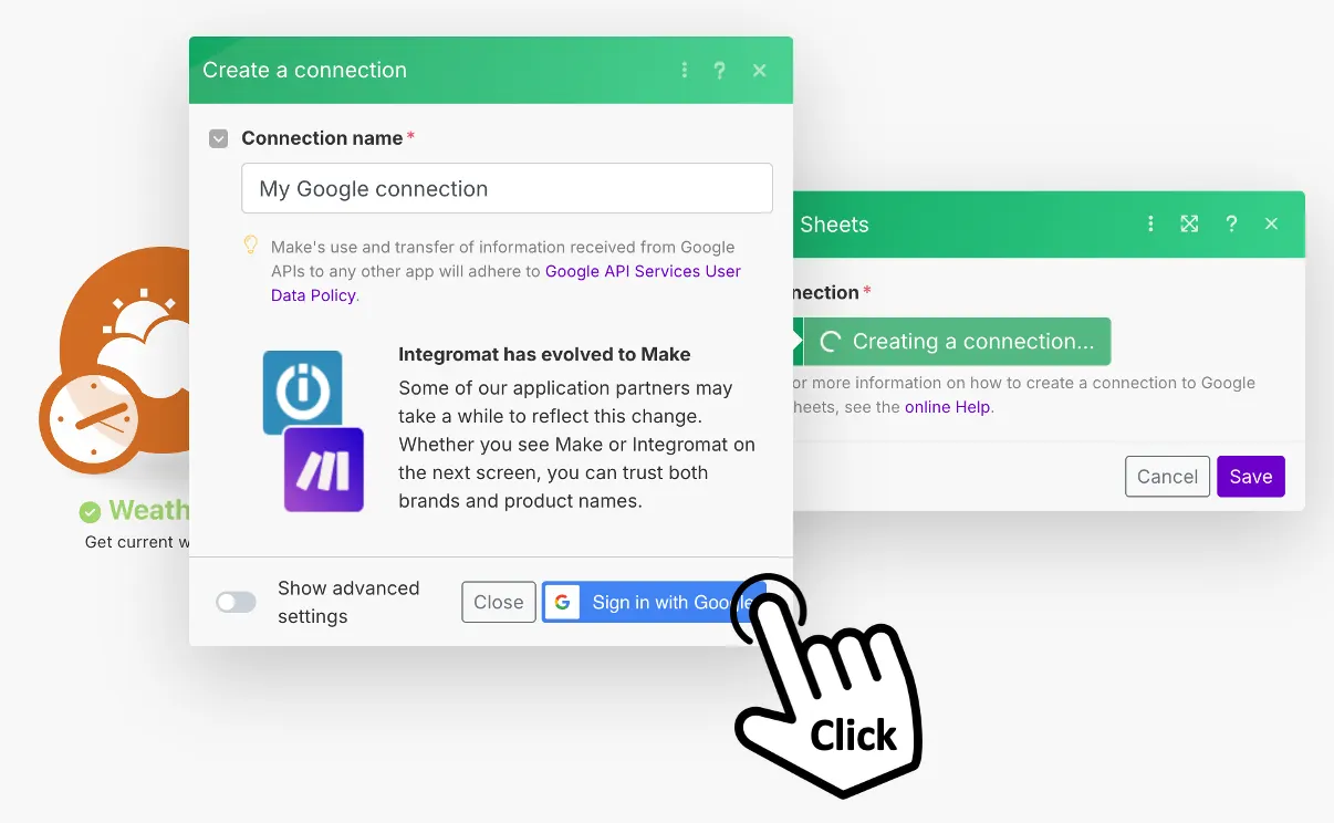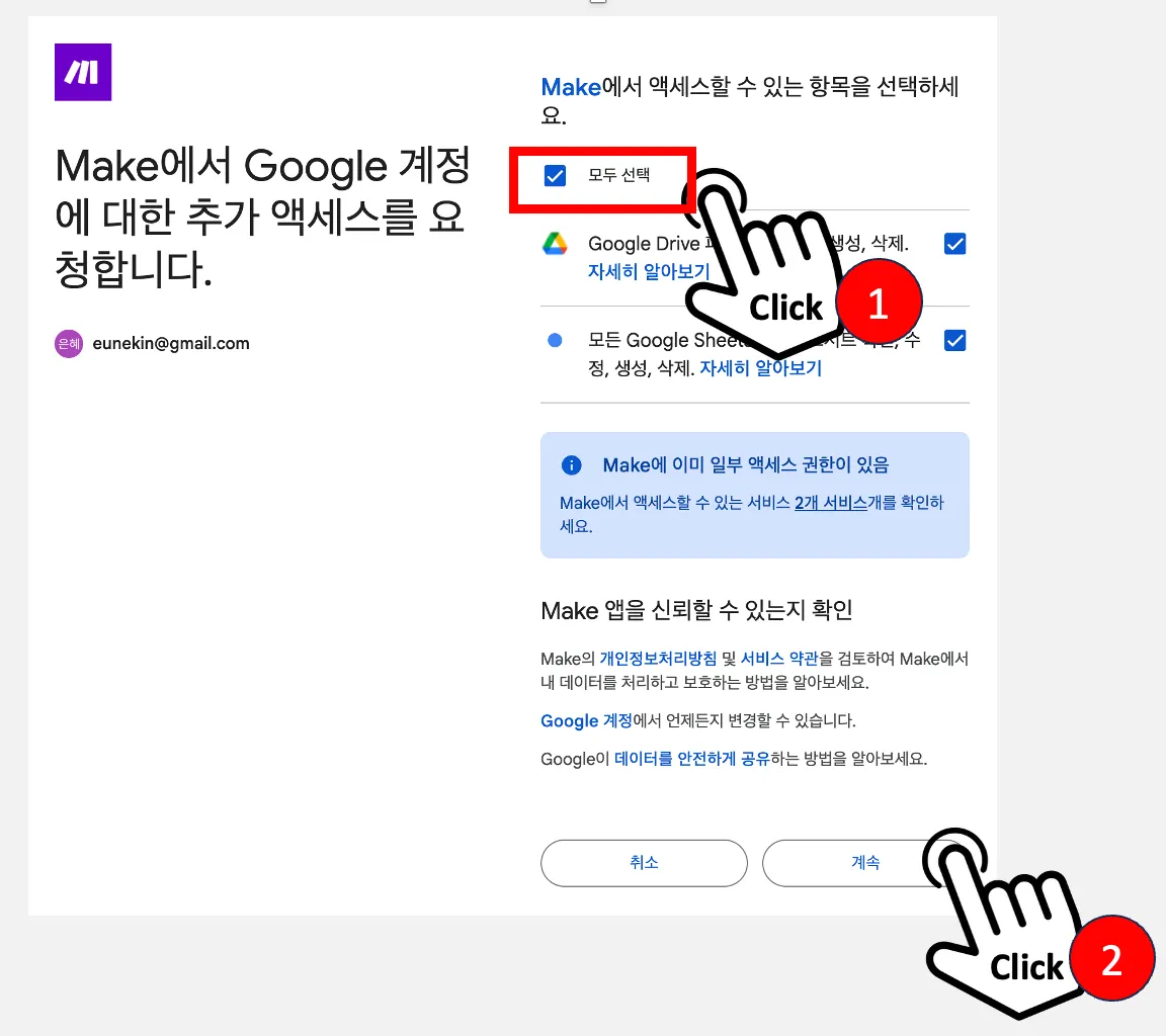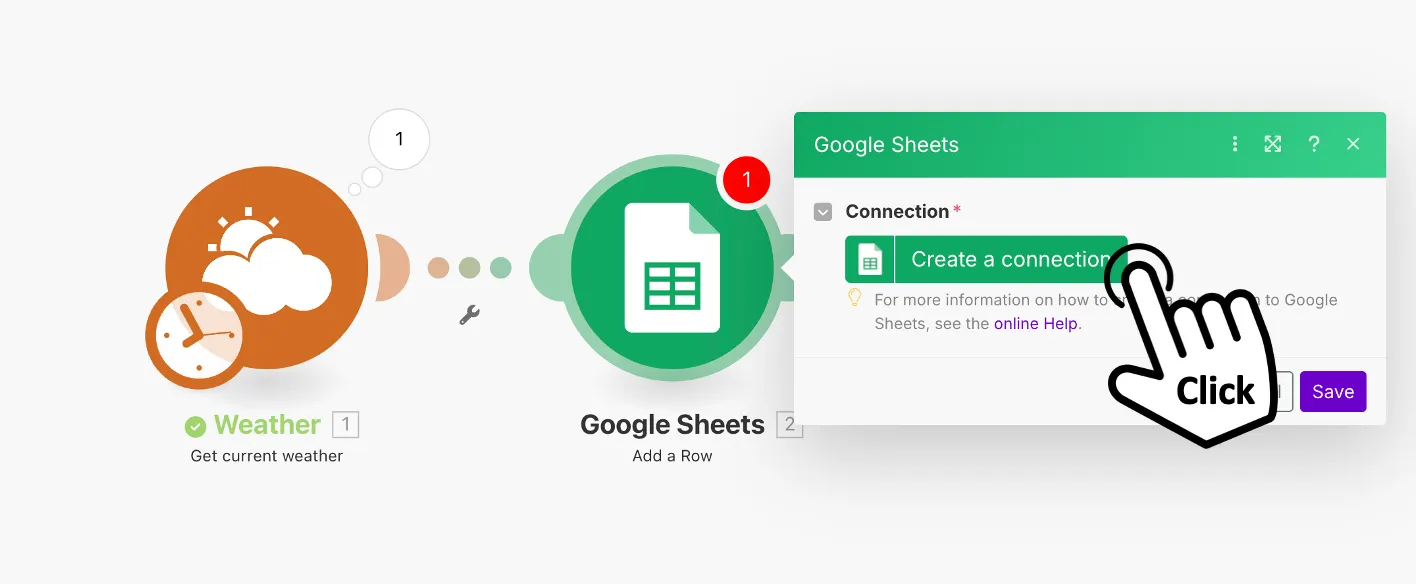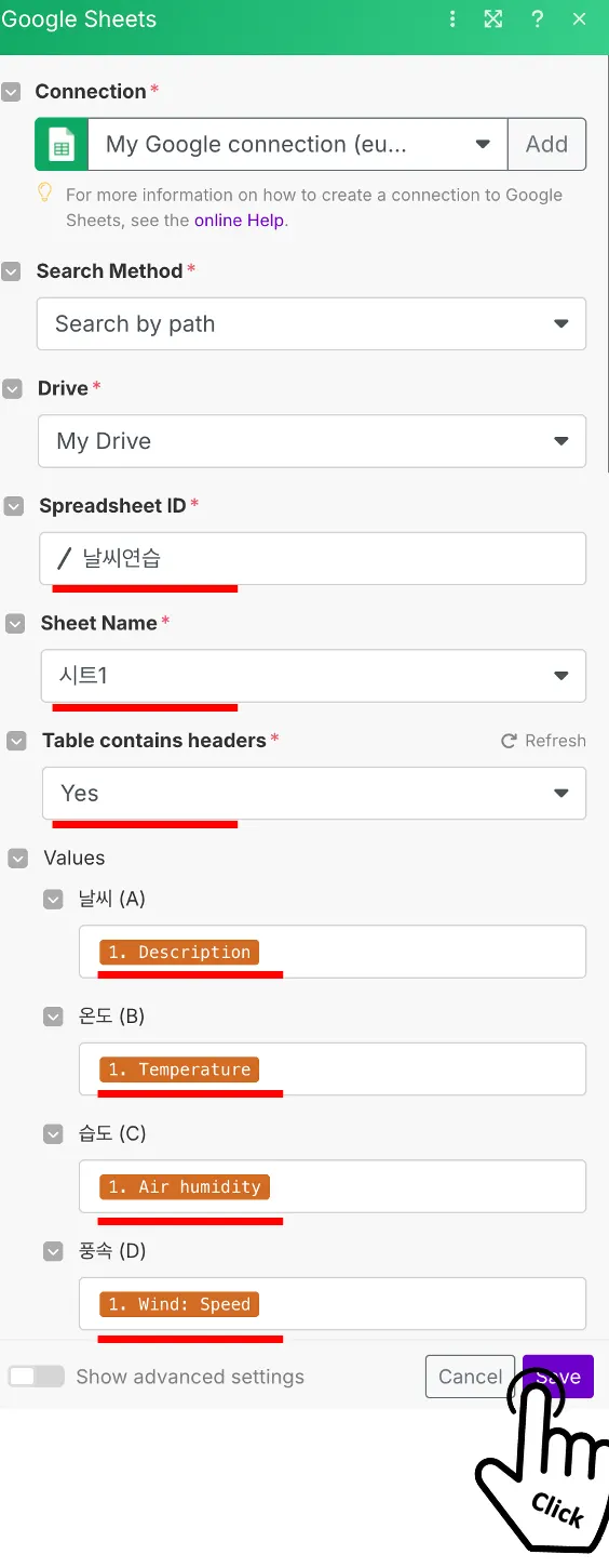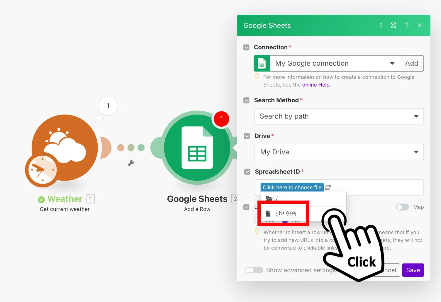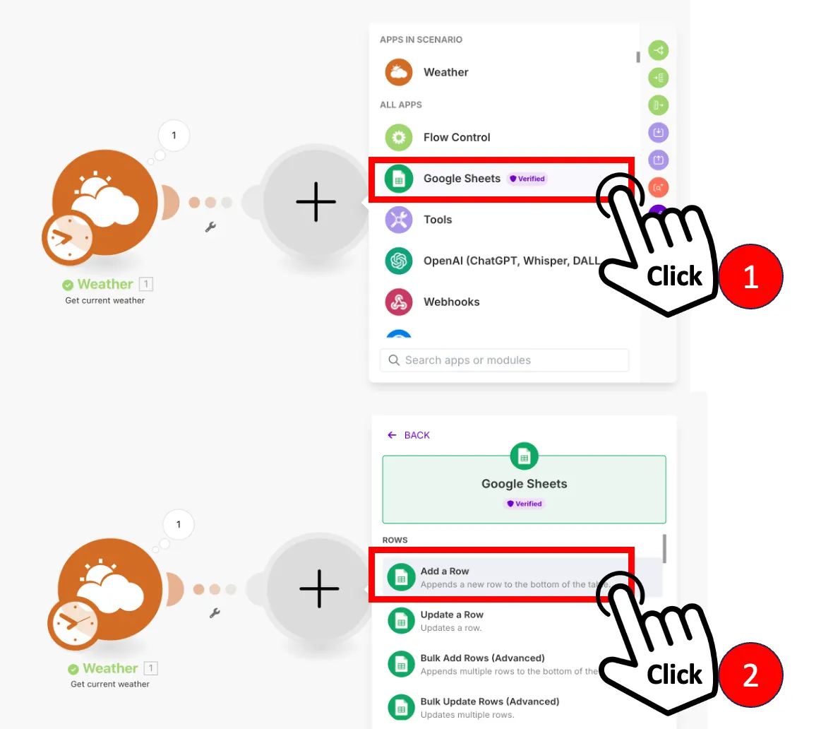 ‘Google Sheets’ 클릭 > ‘Add a Row’ 클릭