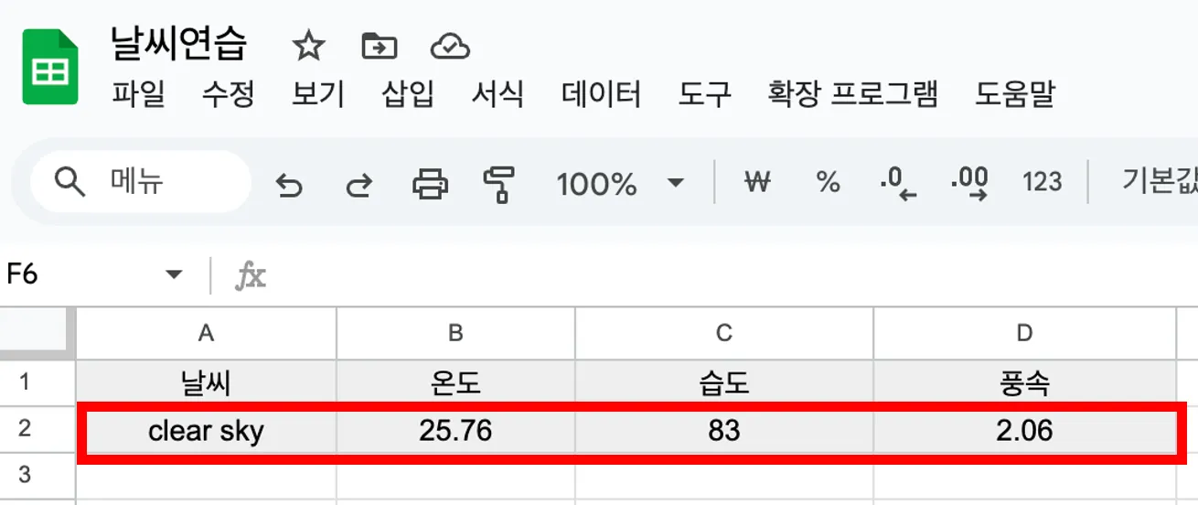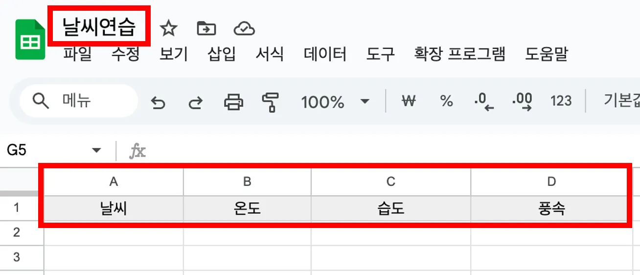 사전작업 : 본인의 구글 스프레드시트로 접속하여 ‘날씨연습’ 파일을 하나 만든다. 아래처럼 A-D 칼럼에 ‘날씨’ , ‘온도’ , ‘습도’ , ‘풍속’ 을 입력한다.
