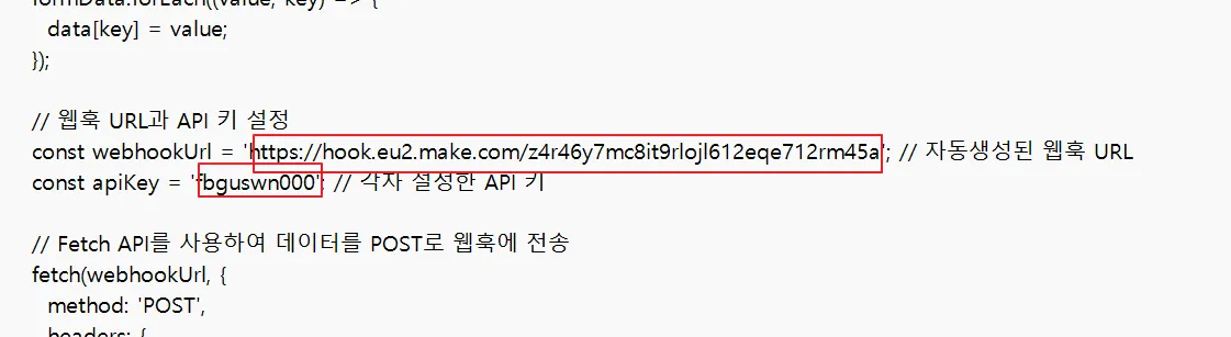 위에서 복사한 웹훅 URL, 그리고 각자 입력한 API 키로 내용 수정