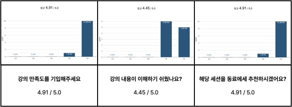 수강생들의 진도가 천차만별임에도 세심하게 다 체크해주려 하는 모습이 정말 좋았습니다 수고많으셨습니다.