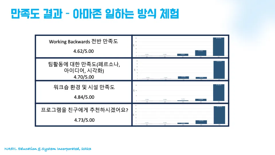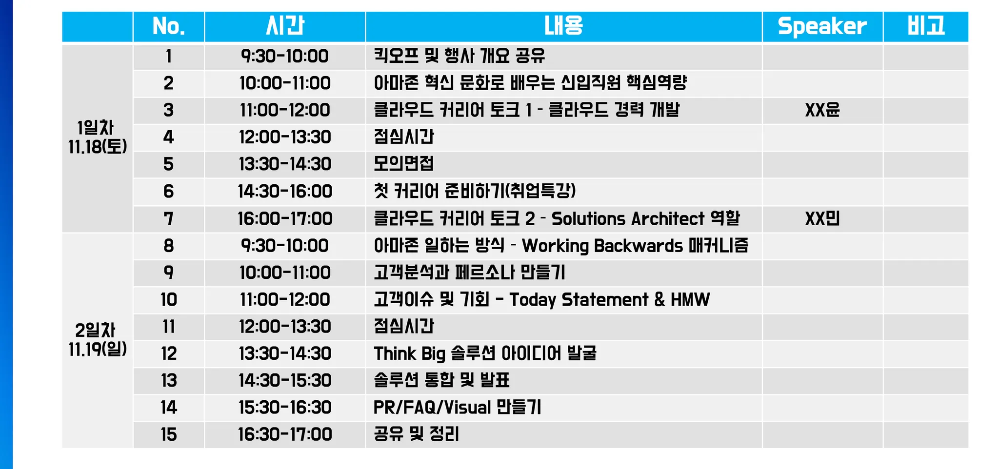 IT/클라우드 관련 커리어를 어떻게 준비해야하는지 하나에서 열까지 체계적으로 접근합니다. 기업입장에서 꼭 필요한 신입직원 핵심역량을 탐색하고 관련 업계에 있는 현직자의 생생한 직무토크와 모의면접을 통해 직무 이해도를 높일 수 있습니다. 실제 아마존에서 제품 개발시 사용하는 아마존 워킹백워드 방식으로 해커톤을 진행합니다. 자연스럽게 아마존 방법론을 터득하고 업무하는 방식을 익힐수 있습니다.