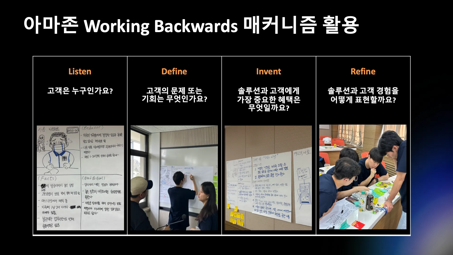 원래 해커톤 요청으로 고객과 미팅을 하다가 아직 참가학생들(지정됨)이 해커톤으로 결과물을 만들어 낼 수 있을정도로 교육을 받거나 경험을 축적하지 못한거 같아서 “아마존의 워킹백워드를 활용한 아이디어톤”을 제안했습니다.