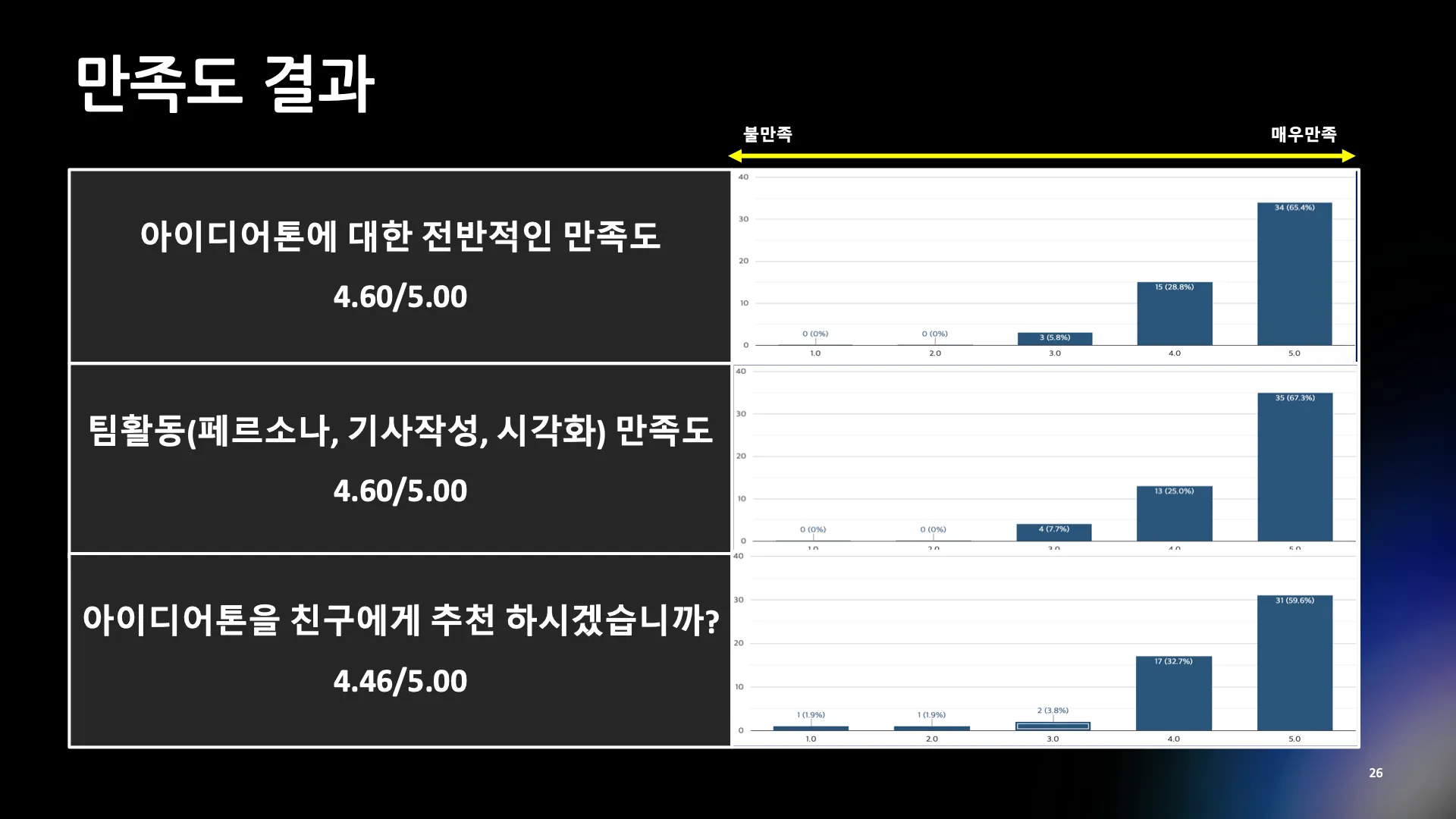“정말로 너무 재미있게 강의를 해주시니 하는 활동에 대해서도 더욱 집중해서 할 수 있었던 것 같습니다 앞에 나와서 발표하거나 말하시는 부분에 있어서도 제가 배울 점들이 많이 있어서 두배로 아이디어톤에서 배워 간 것 같습니다 다음에도 이런 기회에서 또 만날 수 있다면 좋을 것 같습니다”
