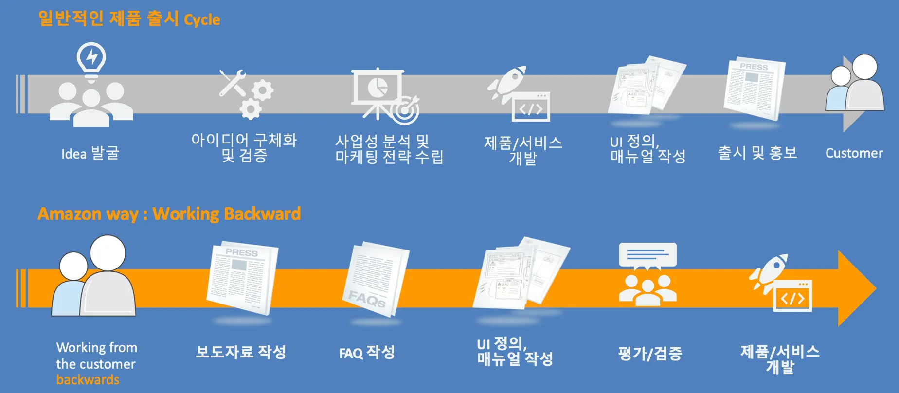 아마존에서 사용하는 제품 개발 방법입니다. 이 방법은 최종 목표인 고객의 문제 해결을 정의하고, 그 목표에 도달하기 위해 거꾸로 일하는 방식으로 접근합니다.