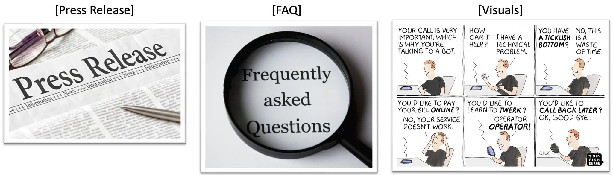 제품 출시 보도자료를 작성하고, FAQ(자주하는질문)를 만들고, 고객경험을 시각화 합니다. 이것은 향후 개발된 제품에 대한 의심을 해방시킵니다. 보도자료, FAQ, 비주얼즈(고객경험 시각화)를 만들어 기업내부에 발행함으로써 다양한 이해관계자의 토론의 장을 만들어 다양한 관점을 갖고 고객의 니즈와 제품을 검증하게 됩니다.