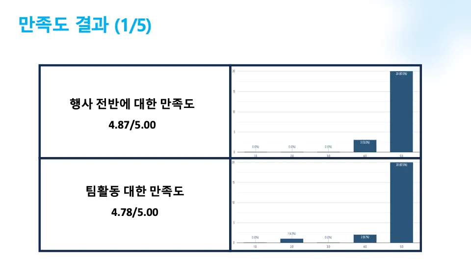 너무너무 재밌었습니다! 팀활동을 통해 협동심과 자유로운 의견 교환을 배울 수 있고 경험할 수 있어서 유익했습니당